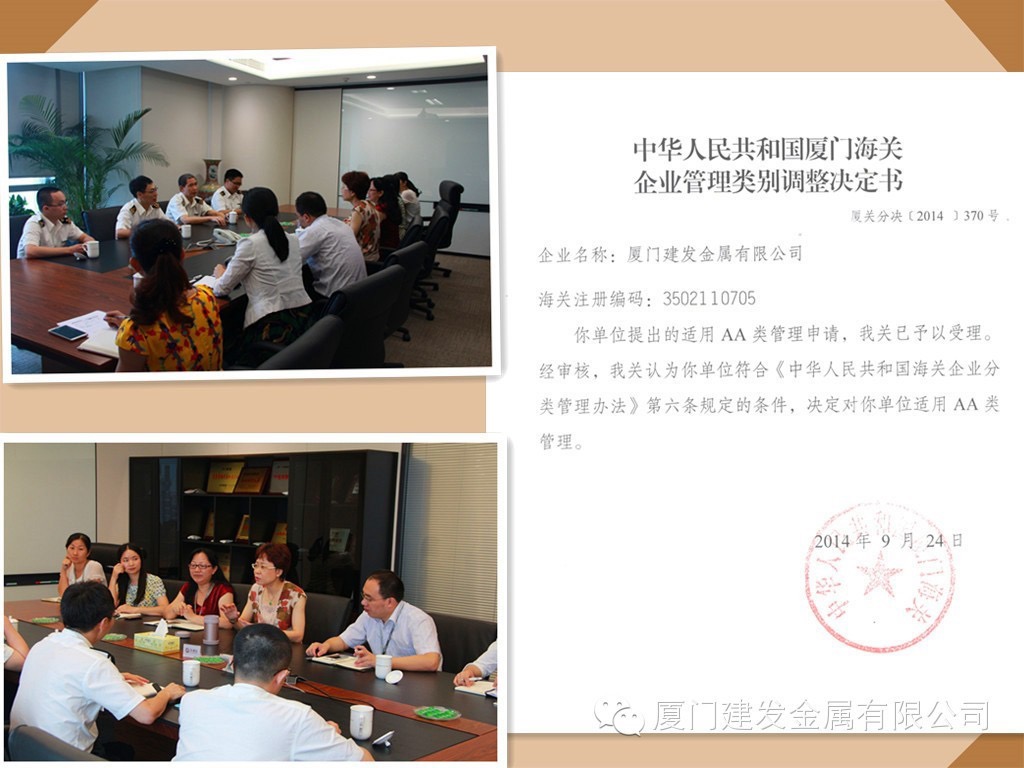 近日,經(jīng)中華人民共和國廈門(mén)海關(guān)審核批準,廈門(mén)建發(fā)金屬有限公司順利獲得海關(guān)“AA類(lèi)管理企業(yè)”資質(zhì)。