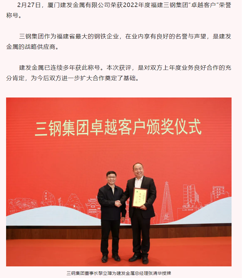 建發(fā)金屬獲評三鋼集團“卓越客戶(hù)”榮譽(yù)稱(chēng)號
